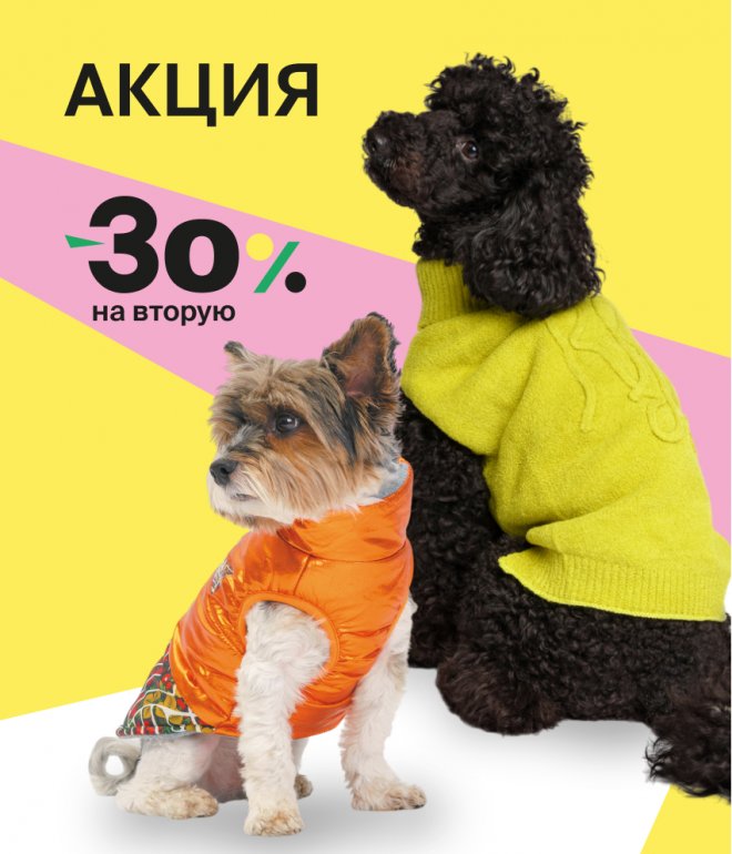 Только до конца октября в сети зоомагазинов «Четыре Лапы» действует супервыгодное предложение: приобретите первый комплект осенней одежды для вашего питомца и получите второй со скидкой 30%!