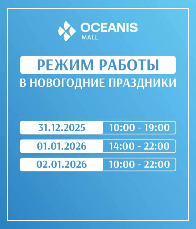 Информируем вас об изменении режима работы Oceanis Mall в предновогодние и праздничные дни.